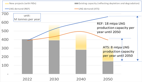 In line with the outlook for natural gas, the outlook for LNG demand will be growing under the REF. Under the ATS, however, the demand for LNG will be growing gradually until shortly before 2040 and then start to decline. The level for LNG demand in 2050 under ATS will be roughly the same as the current level. depletion over time of the existing LNG supply capacity and the addition of projects already sanctioned, the world’s LNG capacity in 2030 will most probably be sufficient to meet demand. But even under the ATS, the LNG supply will face potential shortage in 2040 and 2050. In addition to the existing capacity (net of natural depletion), investment for an annual average addition of 8 million tonnes per year will be needed. While substantial Final Investment Decisions (FIDs) have been made, especially following the invasion of Ukraine, some of those projects for which FIDs have been made might be delayed and the existing capacity may be disrupted due to various factors including geopolitical tensions. Increased investment to mitigate the natural depletion of supply capacity will definitely be needed together with investment to support new projects, in addition to those for which FIDs have been made, to fill-in the potential insufficiency. LNG Supply: Capacity Requiring Investment