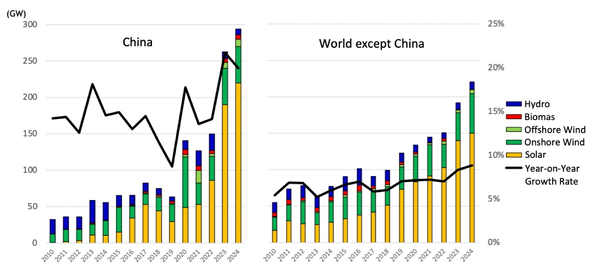 One of the most highly publicized results of COP 28 was the goal to triple the global capacity of renewable energy by 2030. Based on the recent trajectory of expansion of renewable energies, capacity expansion of 2.6 times by 2030 appears possible. With stronger policy push, this number may get closer to the goal of 3X. But we need to look closer into the recent developments. If we split the world into China and the rest of the world, the contrast is shockingly clear. Renewable power capacity growth In 2023, 60% of the global expansion of renewable capacity was realized in China. While the annual growth in the rest of the world was slightly above 10%, the growth in China was more than 20%. If this trend continues, the renewable capacity in China will be 3.8 times more in 2030 compared with 2020, while the growth in the US and Europe will be 2.2 times and 2.0 times respectively. The recent dramatic expansion of renewable energies has been led largely by China. To realize the goal set at COP 28 to triple the global capacity of renewable power, the non-China world will have to do much more. While China deserves credit for the massive deployment of renewable energies, this will be accompanied by the dominance of the global supply of clean energy technologies by China at the same time. This dominance will highlight the urgency of enhancing energy and economic security with regard to clean energy technologies. The world is already dependent on China for the supply of clean energy technologies. This dependence will become even worse in the coming years. Decarbonization should not be pursued at the expense of energy and economic security. Determined actions by countries which share such concerns should be taken to develop alternative sources.
