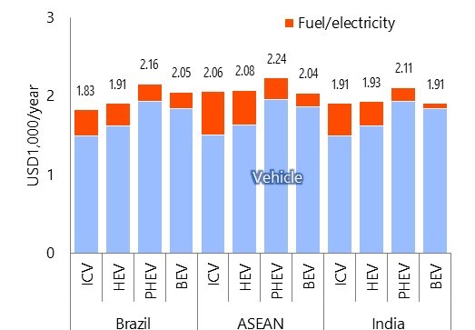 As passenger vehicles are purchased by the consumers, cost will be a major factor for consideration. The full cost of fuel, power, and the vehicle must be considered. IEEJ compared the annualized full cost of various powertrains. The result shows that, among HEV, PHEV and BEV powertrains, HEVs are the lowest-cost option in all regions today. Internal Combustion Vehicles (ICVs) can be slightly less expensive, but considering CO2 emissions, HEVs are the practical option in all four regions today. This finding should not be surprising as the market is showing the popularity of HEVs today. Even in 2050, the cost of HEVs are comparable to the cost of BEVs in ASEAN and India. In Brazil, HEVs can be less expensive than BEVs. In these regions, affordability of passenger vehicles is a major issue. HEVs can provide practical solutions to these regions by offering low cost, low critical mineral consumption and significantly lower CO2 emissions than ICVs. Figure 4: Cost of Vehicle Ownership in 2050 (Brazil, ASEAN, and India) (Source) IEEJ (2024). The IEEJ Outlook 2025.